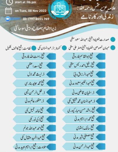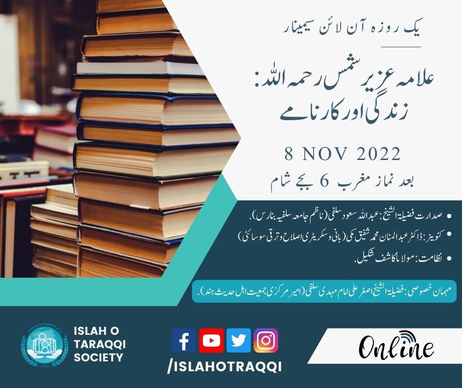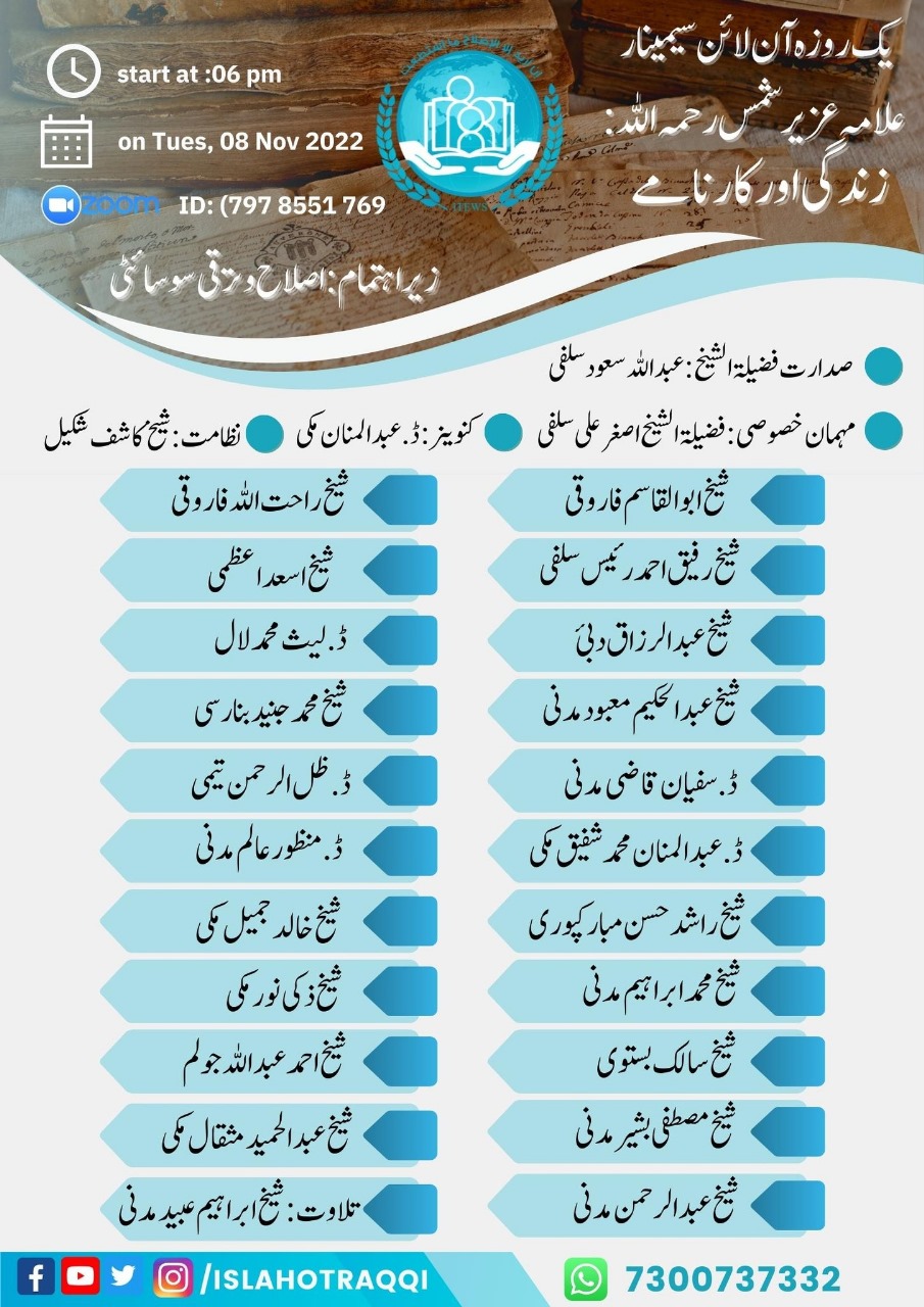 اس مناسبت سے سوسائٹی یہ اعلان کرتی ہے کہ ان شاء اللہ جلد ہی ریکارڈ کردہ پورا سیمینار اس کے یو ٹیوب “اصلاح و ترقی چینل” پر ڈاؤن لوڈ کیا جائے گا اور ہر مشارک کا ویڈیو الگ الگ ہوگا اور جنوری 2022 ع کا اصلاح و ترقی کا مخصوص شمارہ ہوگا اور ان شاء اللہ علامہ عزیر شمس نمبر ہوگا۔ سوسائٹی اپنے مشارکین سے امید کرتی ہے کہ وہ جلد ہی اپنا مقالہ مجلہ کے ایمیل یا میرے واٹس اپ پر بھیج دیں گے ۔